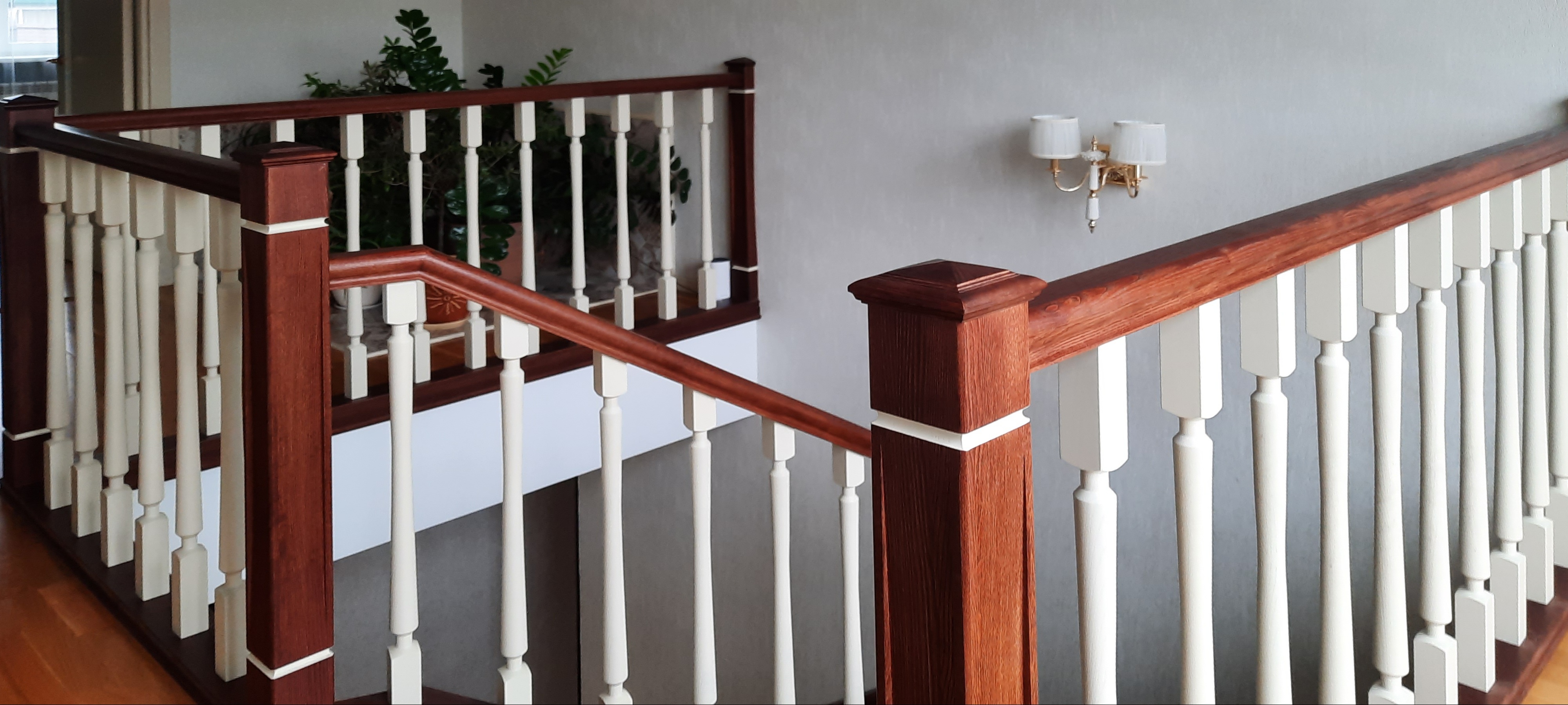 - Лестница на металлокаркасе из массива ясеня со столбом переходящим в поручень